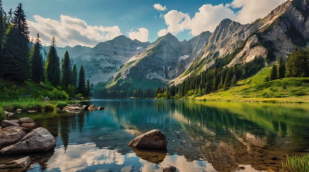 serene mountain lake surrounded by lush evergreen forest