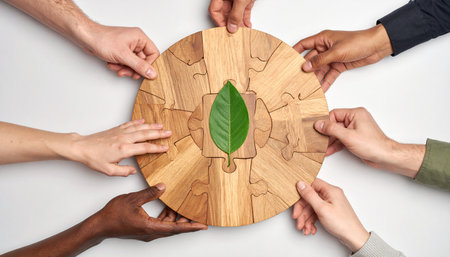 A diverse group of hands joins together to complete a circular wooden puzzle.