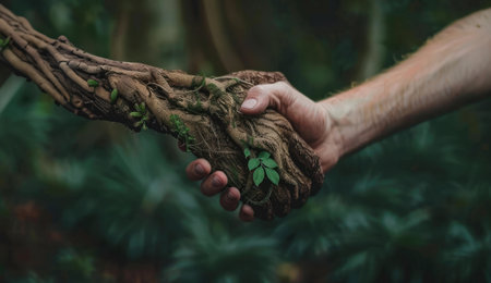 Two male hands with dark skin gently hold a small branch with fresh green leaves against a sunny blurred forest background symbolizing connection and care for the natural environment.