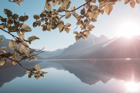 The tranquil lake mirrors surrounding mountains and lush forests, creating a perfect moment of serenity during the early morning hours. Nature invites calmness and reflection.