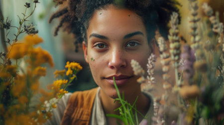 African American woman in a garden surrounded by vibrant flowers. Black female in greenhouse. Concept of natural beauty, tranquility, garden lifestyle, relaxation, gardening.