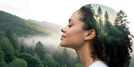 Double exposure of a woman with a forest landscape. Nature and mindfulness concept