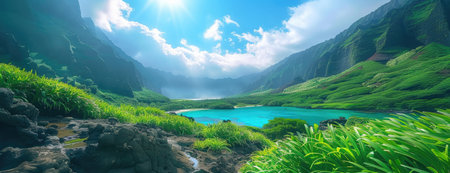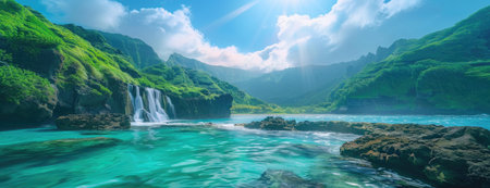 Serene tropical scene showing towering cliffs and lush greenery surrounding tranquil turquoise waters. ideal for travel inspiration, relaxation themes, and exotic getaway promotions.