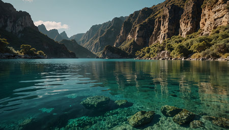 AI Generated. A tranquil teal-colored lagoon nestled among towering cliffs, its peaceful waters reflecting the beauty of the surroundings