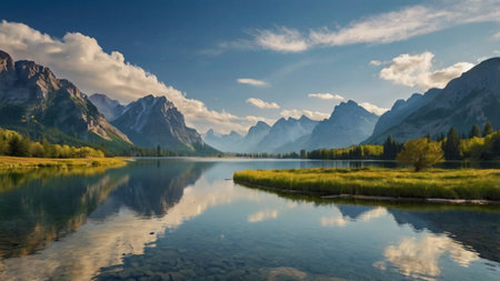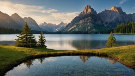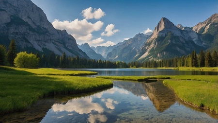 A stunning mountain landscape with a serene lake reflecting the majestic peaks and lush forests under a bright blue sky, ideal for nature enthusiasts.