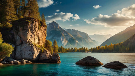 Serene lake surrounded by dramatic mountain cliffs, reflecting vibrant colors of nature. clear water reveals smooth stones beneath, creating tranquil atmosphere in this picturesque alpine setting