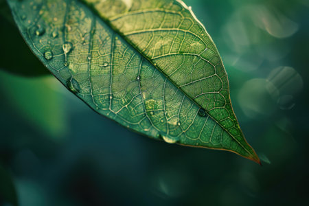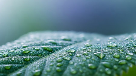 Detailed view of a leaf's surface with water beads, capturing the essence of natural patterns and textures.