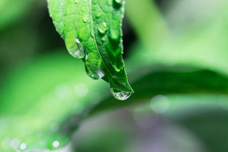 Closeup of waterdrops rolling on green leaves in the garden after rain