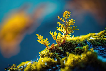 Beautiful green and orange moss in the sunlight, moss closeup, macro. Nature Wildlife. Copy space banner. Selective focus. Spring or autumn nature background