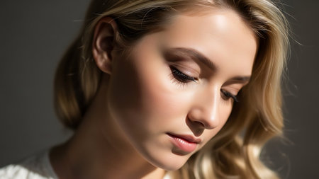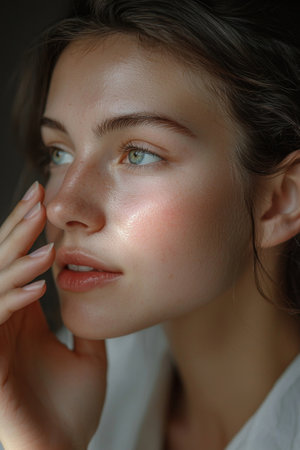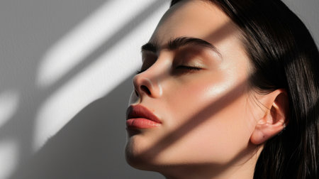 This captivating portrait showcases a woman with natural makeup, elegantly posed in soft light. The interplay of shadows and light accentuates her serene expression and smooth skin, creating a tranquil and artistic atmosphere.