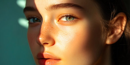 A young woman gazes directly at the viewer, illuminated by soft sunlight that highlights her radiant skin and captivating eyes, set against a tranquil background