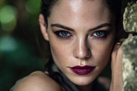 Intense gaze from a woman with striking makeup, featuring bold purple lips and dramatic eye makeup. Her expression is serious and captivating, set against a blurred natural background