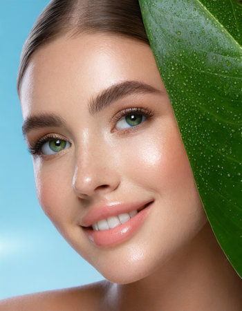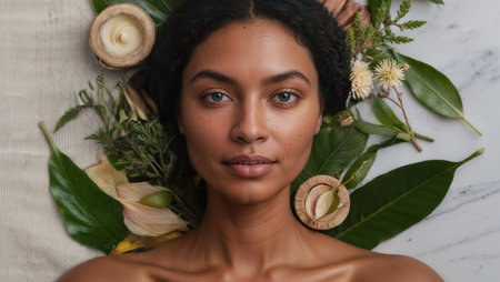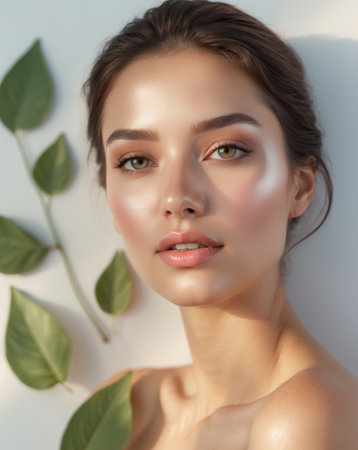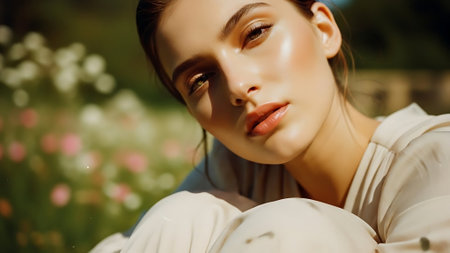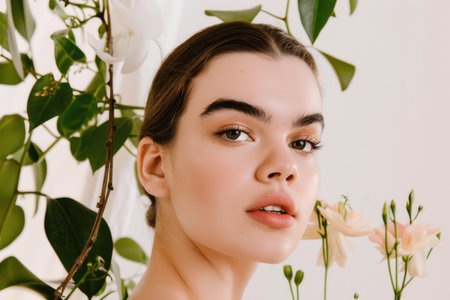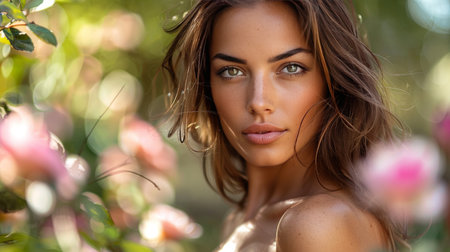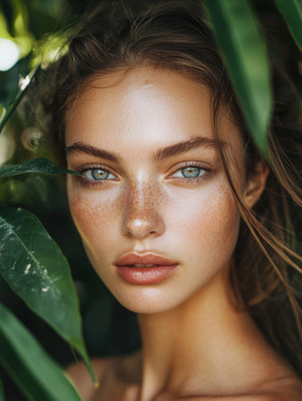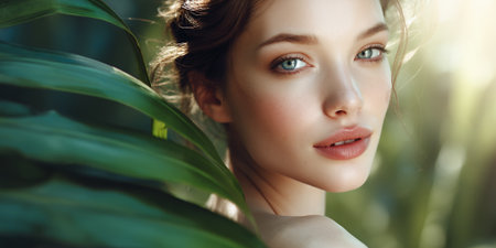 Captivating portrait of a young beautiful woman with flawless dewy skin surrounded by lush vibrant greenery in a peaceful natural environment