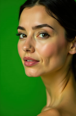 Studio portrait of a beautiful young woman with flawless skin and makeup, posing against a green screen, creating a captivating image for beauty and fashion projects