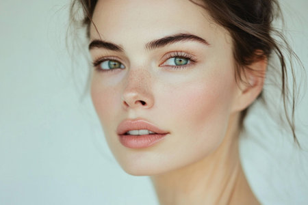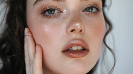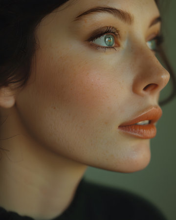 This captivating close-up portrait showcases a beautiful woman's radiant skin and expressive features, emphasizing natural beauty and elegance.