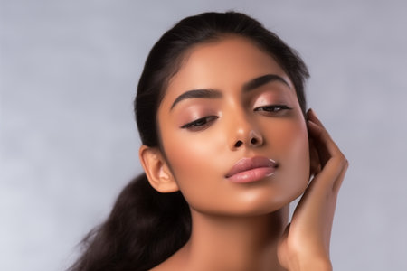 Beautiful young Indian woman takes care of her skin, posing over gray background