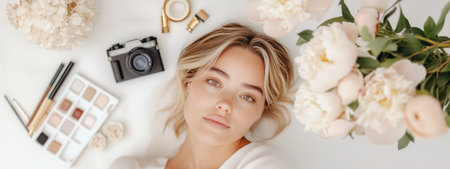 Young woman surrounded by makeup, flowers, and photography gear in a light, artistic setting