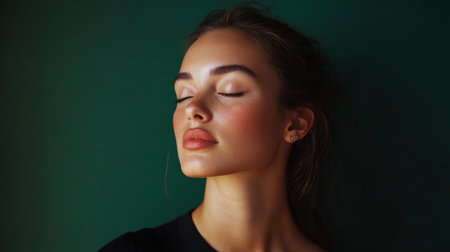 Captivating portrait of a young woman with closed eyes against a deep green background