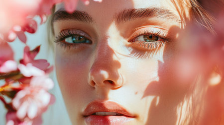 A beautiful close-up portrait of a woman with soft natural lighting, framed by pink blossoms, evoking a feeling of spring and freshness.