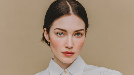 Captivating portrait of a young woman with natural beauty against a neutral backdrop