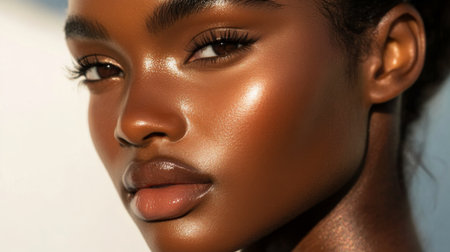 Striking Black woman with glowing skin bold makeup and stylish braided bun