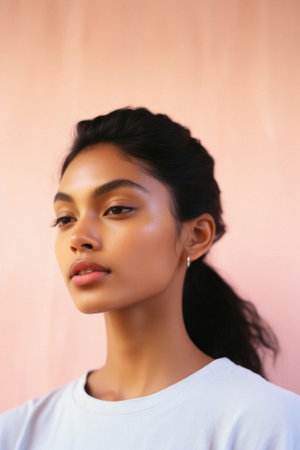 Young pretty cool Indian woman model wearing tshirt looking at camera standing on color background. Face skin care cosmetics makeup, fashion ads. Beauty portrait. White t-shirt mock up template.