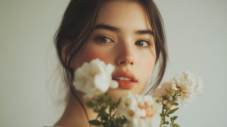 This captivating portrait showcases the serene and ethereal beauty of a young woman her face radiating a natural glow and delicate elegance