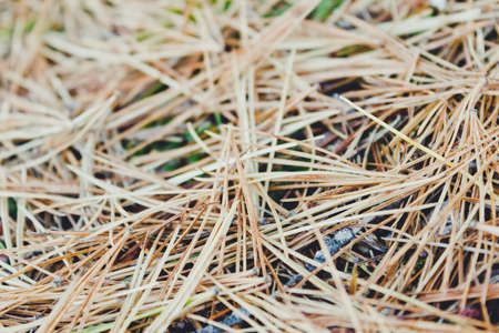 Coniferous needles on a green moss in a cedar grove. Forest life, wildlife coniferous forest.