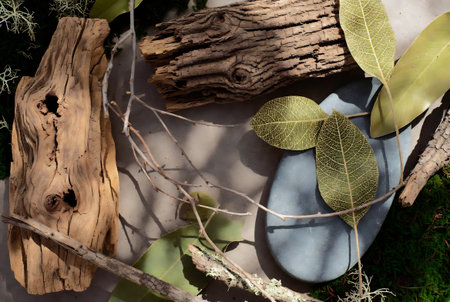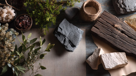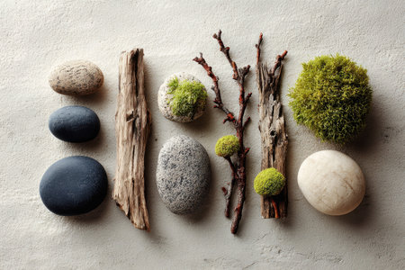 A serene composition featuring natural stones, wood elements, and greenery showcasing earthy textures. Ideal for projects in home decor and design.