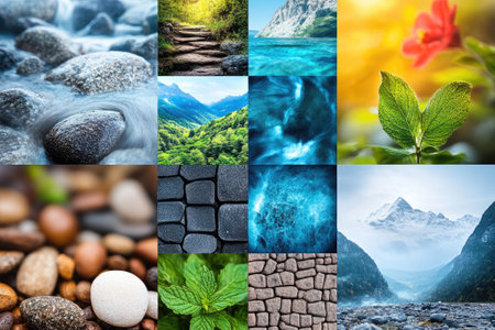 Collage including multiple images of nature such as plants, rocks, water and mountains