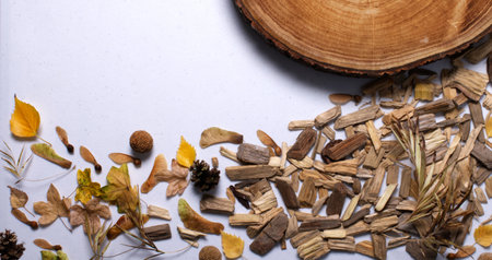 Decorative wood chips with autumn leaves with copyspace