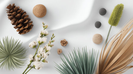 A serene composition of natural elements including a pine cone, palm leaves, and cotton stems arranged on a soft white fabric, perfect for showcasing organic beauty.