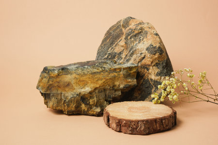 Round Wood cut podium, stone, decorations concept over beige Background for perfume, jewelery and cosmetic products.