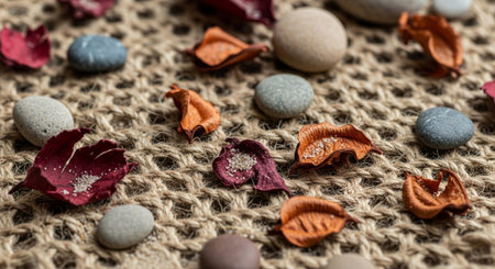 Natural stones and leaves on jute background in close-up
