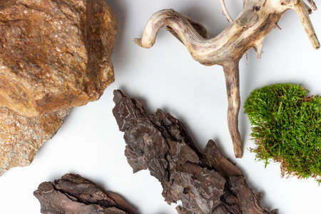 Green moss, stones and dry tree branches on an a white background
