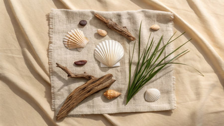Natural seashells, driftwood and green grass arranged on linen cloth, top view on beige fabric background, concept of coastal decoration