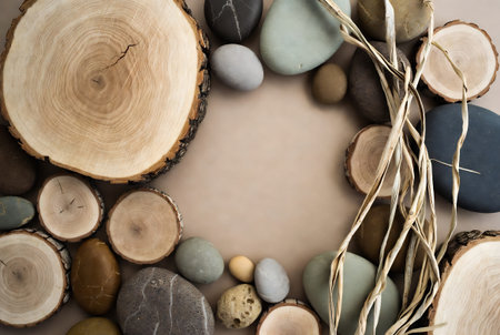 An arrangement features wooden blocks, stones, and organic materials. The composition displays various textures and natural colors, with a soft overhead lighting. It could be suitable for illustrating concepts related to design, construction, or environmental themes. It's adaptable for diverse commercial projects.