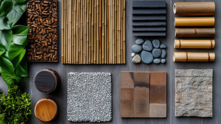 A collection of eco-friendly building materials, showcasing bamboo, recycled wood, and natural stone.