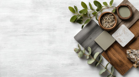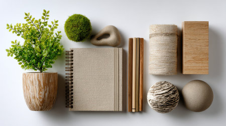 This image showcases an elegant arrangement of natural materials, greenery, and decorative elements, perfect for inspiration in modern design and creative settings.