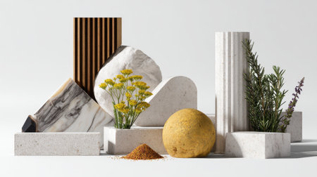 This captivating image showcases a harmonious arrangement of minimalist decorative objects and natural elements, ideal for interior design inspiration.