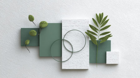 This modern composition features geometric shapes in green and white, accented by natural leaves, creating a serene and stylish decorative piece for any space.