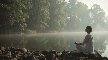 A peaceful woman practices meditation in a lotus pose by a tranquil lake at sunrise. The serene natural setting with water and trees enhances the atmosphere of mindfulness and spiritual wellness.