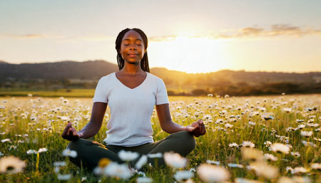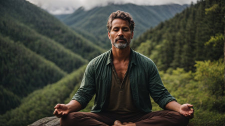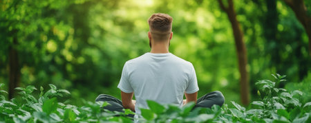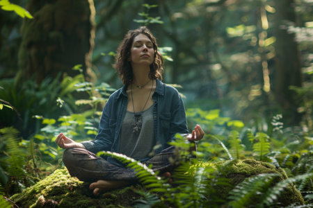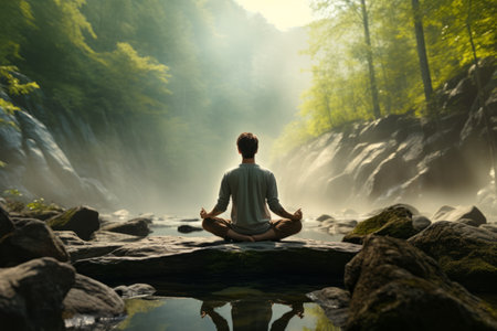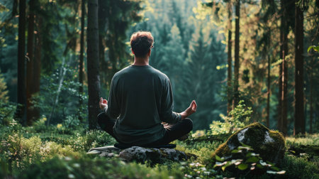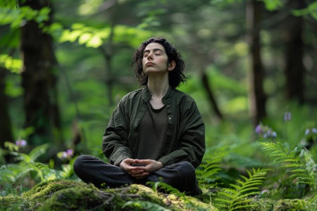 A serene individual is meditating in a stunning natural environment, surrounded by lush greenery. This peaceful scene captures the essence of mindfulness and tranquility, ideal for promoting wellness and relaxation themes.