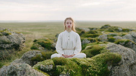Solo meditation during daylight on moss-covered rocks in an open field