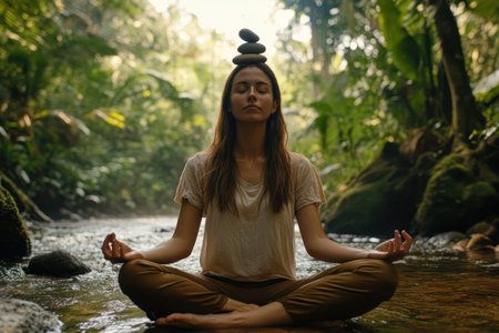 A serene young woman meditates in a lush forest with balanced stones on her head, surrounded by calming natural beauty.