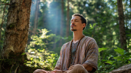 Amidst the emerald embrace of a tranquil forest, a man seeks inner peace through mindfulness He breathes deeply, immersing himself in the serene surroundings Tranquility washes over him as he connects with the soothing energy of nature, finding solace and harmony within himself AI Generative
