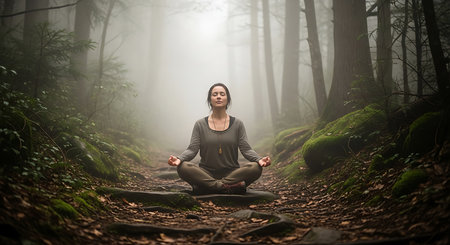 A person practices meditation in a tranquil forest surrounded by tall trees and soft sunlight filtering through the leaves creating a peaceful atmosphere.