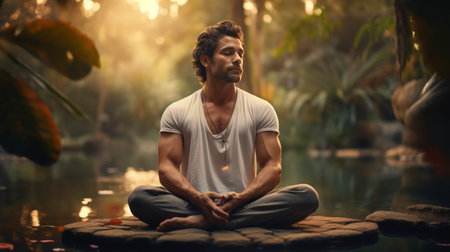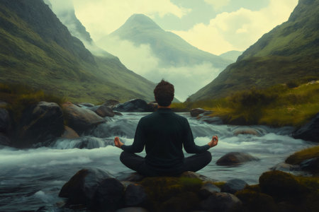 Man practicing yoga in a serene mountain landscape, meditating in lotus pose beside a gently flowing stream, embracing tranquility and balance