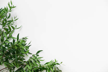 Leaves minimal background. Nature composition. Fresh green tree branches isolated on white copy space.