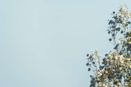 Baby's breath gypsophila on blue background with long shadow. Top view close up flatlay